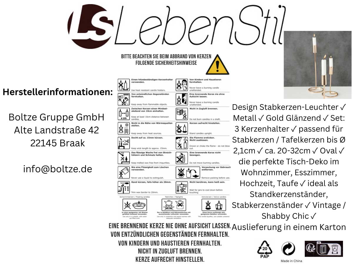 Design Stabkerzen-Leuchter ✓ Metall ✓ Gold Glänzend ✓ Set: 3 Kerzenhalter ✓ passend für Stabkerzen / Tafelkerzen bis Ø 2,1cm ✓ ca. 20-32 cm ✓ Oval ✓ die perfekte Tisch-Deko im Wohnzimmer, Esszimmer, Hochzeit, Taufe ✓ ideal als Standkerzenständer, Stabkerzenständer ✓ Vintage / Shabby Chic ✓