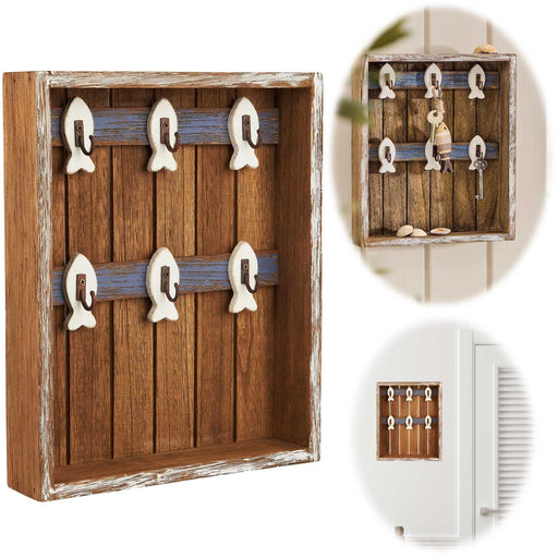 Nautico Schlüsselboard ✓ Holz ✓ Shabby Braun / Blau / Weiß ✓ 6 Haken ✓ ca. 30x24x5cm ✓ passend für 6 Schlüssel plus Ablage ✓ Wandmontage ✓ 1 stabi...
