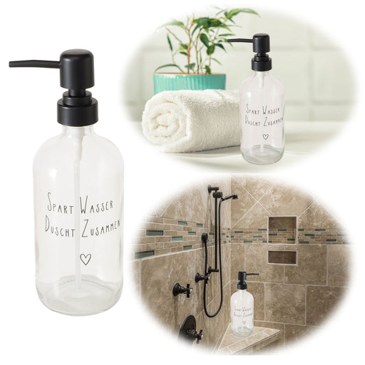 Exklusiver Seifendosierer ✓ Glas ✓ Durchsichtig ✓ mit lustigem Spruch: SPART WASSER DUSCHT ZUSAMMEN ✓ Spender: Kunststoff Schwarz ✓ ca. 0,5L Volum...
