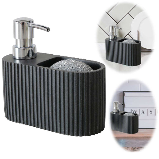Exklusiver Seifendosierer mit Schwammhalter ✓ hochwertiges Kunstharz ✓ Schwarz ✓ Relief Design ✓ Spülmittelspender: Kunststoff Silber ✓ ca. 100ml ...