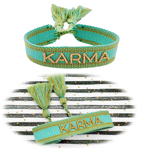Exklusives Quasten Stoffarmband ✓ bestickt ✓ Slogan: Karma Baby ✓ Multi Colour / Bunt ✓ Boho & Hippie Style ✓ ca. 16-20 x 1,9cm ✓ waschbar ✓ c...