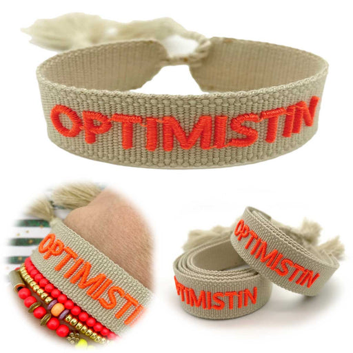 Exklusives Quasten Stoffarmband ✓ bestickt ✓ Slogan: Optimistin ✓ Neon Pink Orange ✓ Boho & Hippie Style ✓ ca. 16-20 x 1,9cm ✓ waschbar ✓ cool...