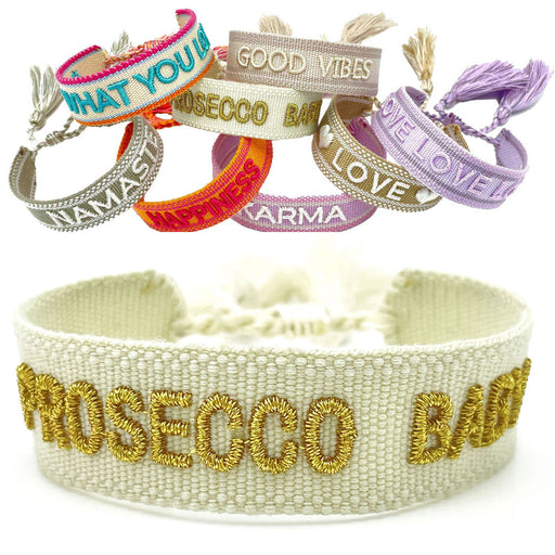 Exklusives Quasten Stoffarmband ✓ bestickt ✓ Slogan: Prosecco Baby ✓ Neon Pink / Orange ✓ Boho & Hippie Style ✓ ca. 16-20 x 1,9cm ✓ waschbar ✓...