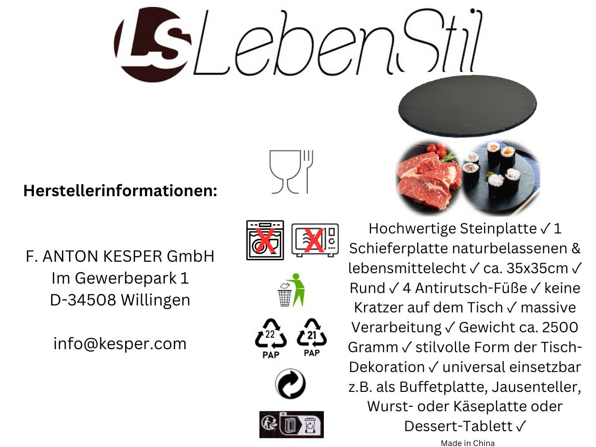 Hochwertige Steinplatte ✓ 1 Schieferplatte naturbelassenen & lebensmittelecht ✓ ca. 35x35cm ✓ Rund ✓ 4 Antirutsch-Füße ✓ keine Kratzer auf dem Tisch ✓ massive Verarbeitung ✓ Gewicht ca. 2500 Gramm ✓ stilvolle Form der Tisch-Dekoration ✓ universal einsetzbar z.B. als Buffetplatte, Jausenteller, Wurst- oder Käseplatte oder Dessert-Tablett ✓
